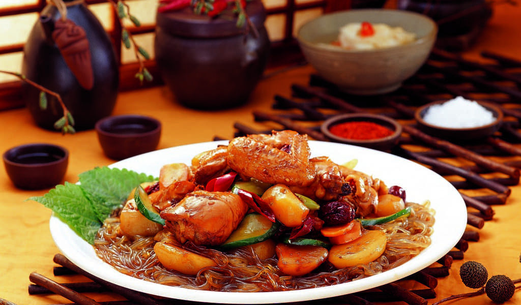 Dakdoritang (korean chicken stew with carrots, colored potatoes and green chili peppers)